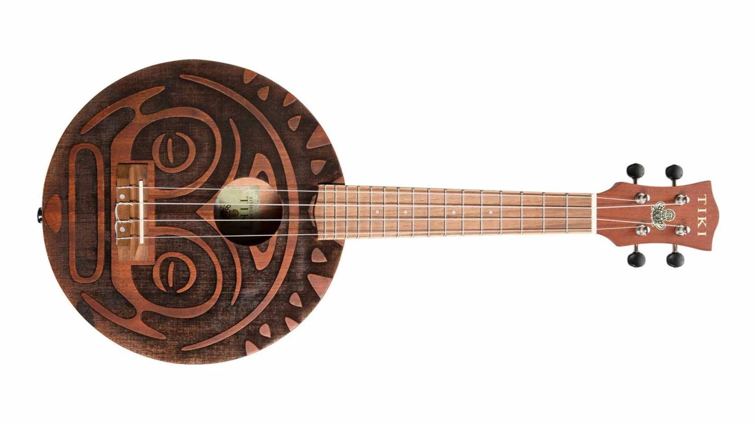 The Tiki “Tiki Man” ukulele features round body construction with engraved Tiki logo face on the soundboard.